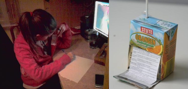 Con el mismo cartón de tu jugo, haz una tapa que se pueda bajar y volverse a subir. Recuerda hacer algo para que ésta se pueda volver a pegar en caso de que venga el maestro. El corte debe ser muy fino para que no se note que está cortado el empaque.
