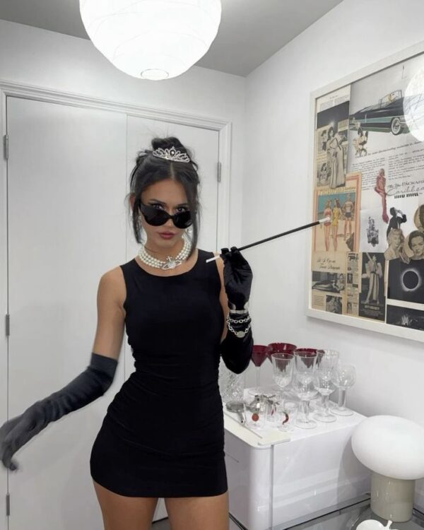 El icónico vestido negro con guantes largos, pero versión Halloween: más corto, más atrevido, más tú. Perfecto para una estética “old money meets bad girl”.