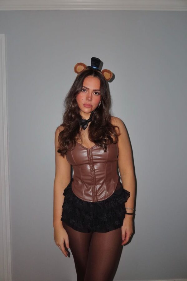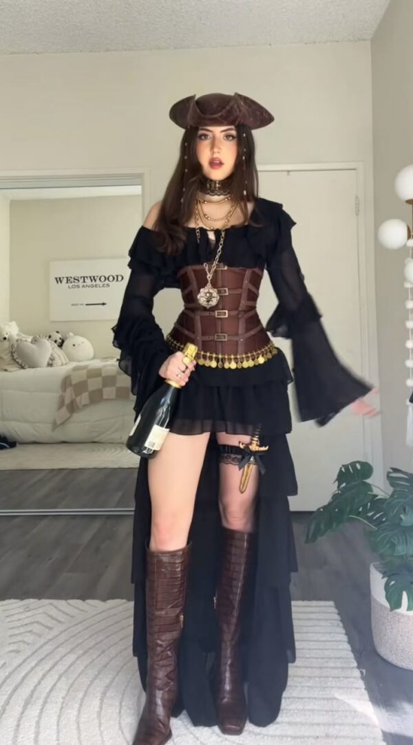 Corset café, falda negra con vuelos y botas altas. Te verás lista para robar tesoros o corazones, lo que pase primero.