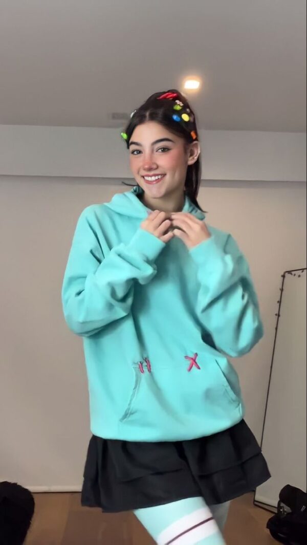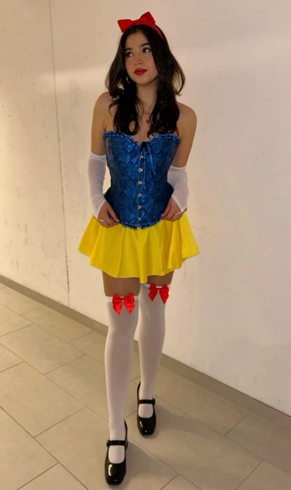 Sudadera pastel, medias rayadas y cara angelical con energía de “podría destruirte, pero sonrío mientras lo hago”. Un disfraz cute con ese toque perturbador que siempre funciona.
