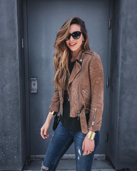La gamuza jamás estará fuera de moda y menos en una chamarra café.