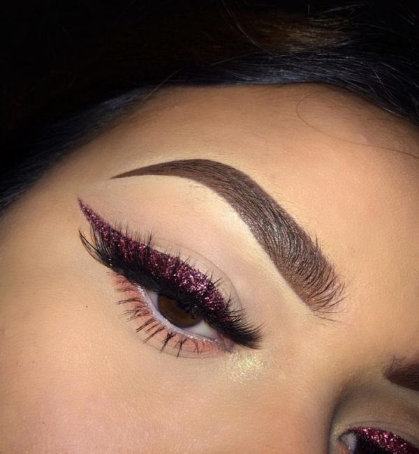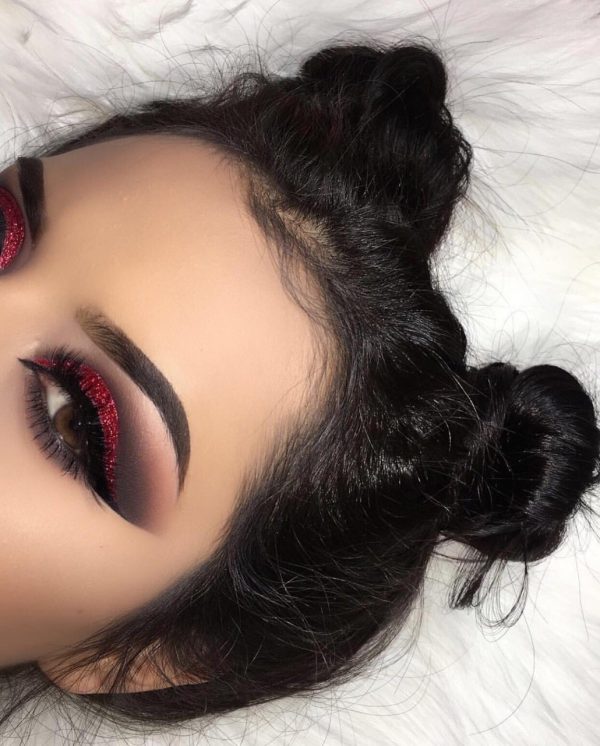 El delineado rojo de glitter también es buena opción, en especial si no vas a tener mucho tiempo para producir tu maquillaje. Lo mejor de todo es que luce genial incluso sin ninguna sombra.