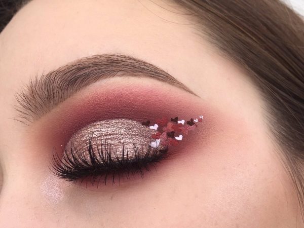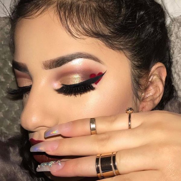 Un delineado con corazones te harán la sensación. Ponte una sombra de colores fríos, brillos en forma de cut crease y en lugar de hacer el típico delineado haz varios corazones de colores.