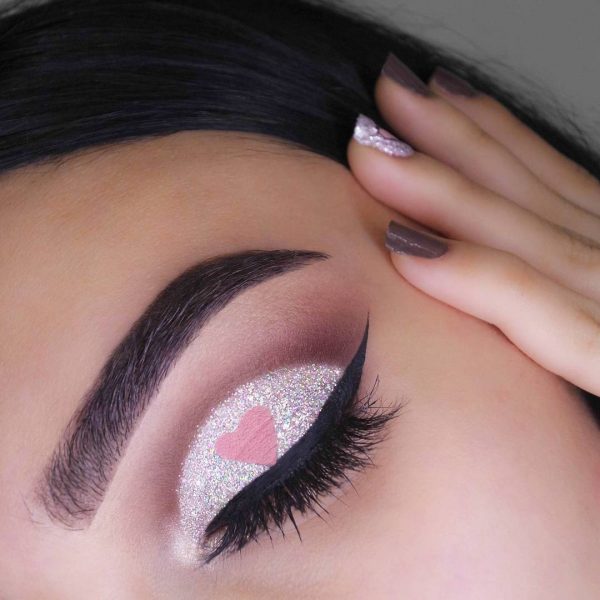 Una sombra glitter con adorno de corazón. Sé que a muchas no les agradan los adornos en la sombra de ojos, pero un detallito chiquitito no luce mal y te hace lucir diferente al resto…