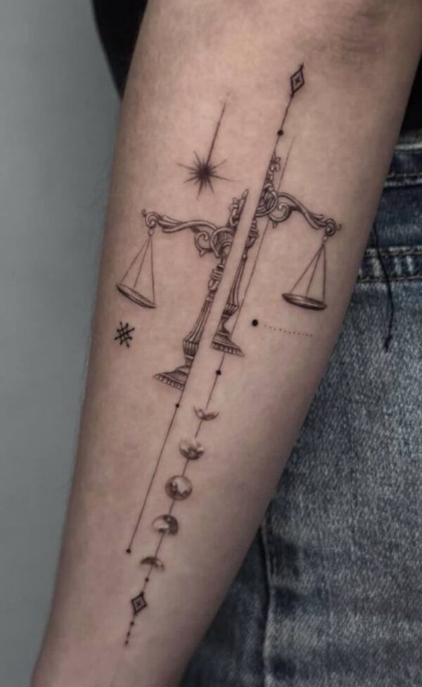 Discreta, limpia y con un poder simbólico gigante. Representa tu compromiso con el equilibrio, pero sin gritarlo. En el brazo es ideal porque lo ves cuando trabajas, como un recordatorio de que ni la pasión ni la razón deben inclinarse demasiado.