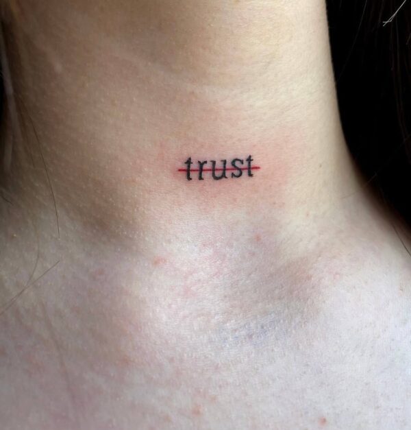 El tatuaje más honesto que puedes tener. “Trust”, pero tachado, porque ya aprendiste que no se confía tan fácil. En el cuello, porque es una zona visible, vulnerable y poderosa. Es el recordatorio de que la confianza se gana, no se regala.