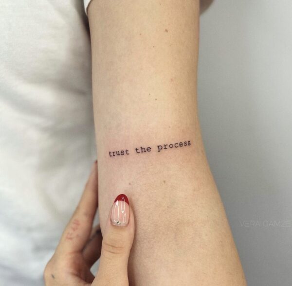 Este tatuaje es para las que están en su era de paciencia, no de prisa. “Confía en el proceso” suena cliché, hasta que lo vives. En el antebrazo se siente como una promesa contigo misma: las cosas se acomodan, pero no sin caos previo.