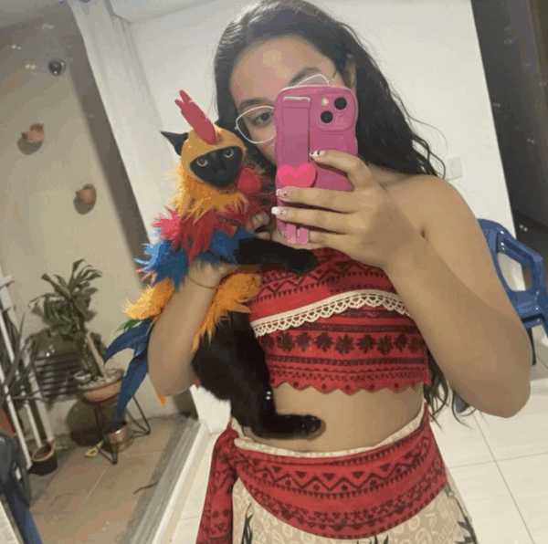 Ella lista para salvar el océano, él con plumas de colores y cara de “no entiendo nada, pero voy contigo”. Este disfraz es el equilibrio perfecto entre caos, color y carisma.