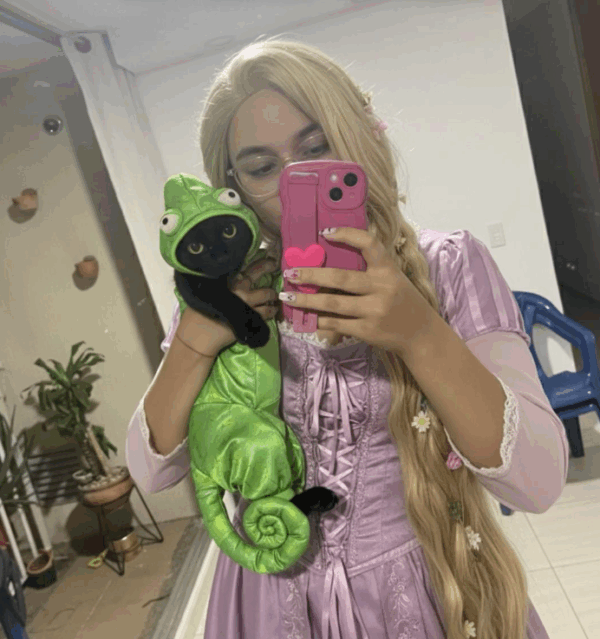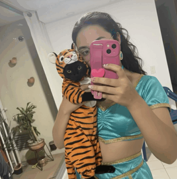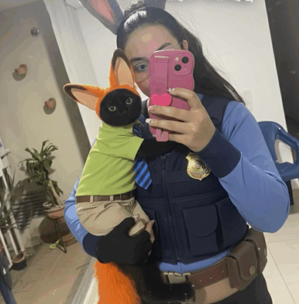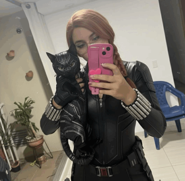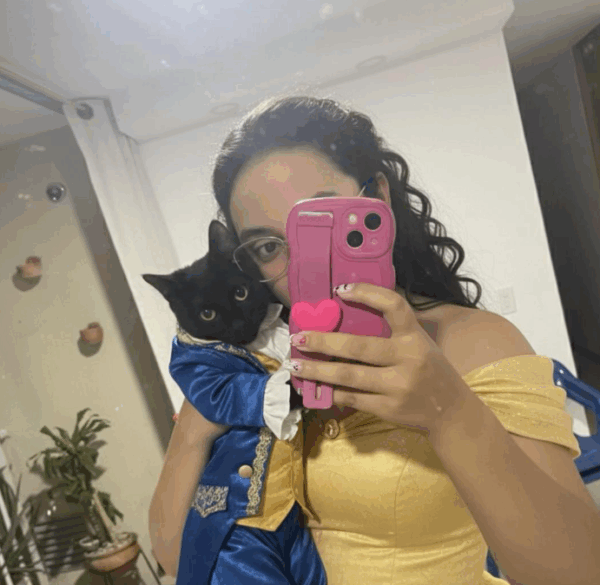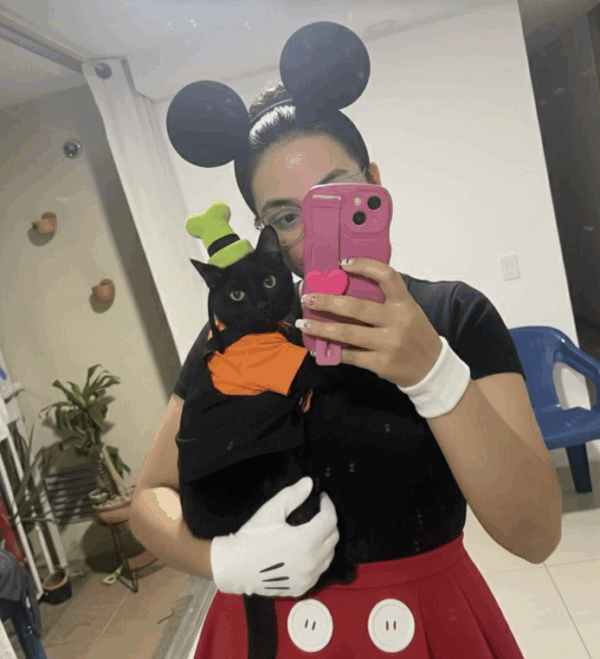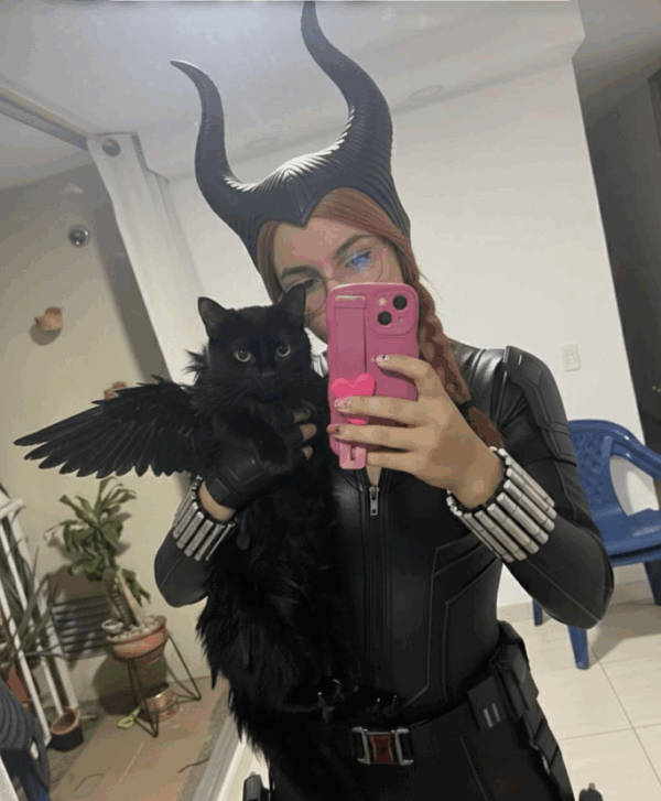 Ella y su gato listos para infiltrarse en cualquier fiesta y robar miradas.