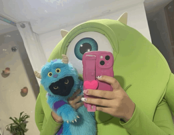 El gato, una bola peluda azul con cuernos que parece sacado directo de Pixar. Literal: el miedo no da miedo si se ve así de cute.