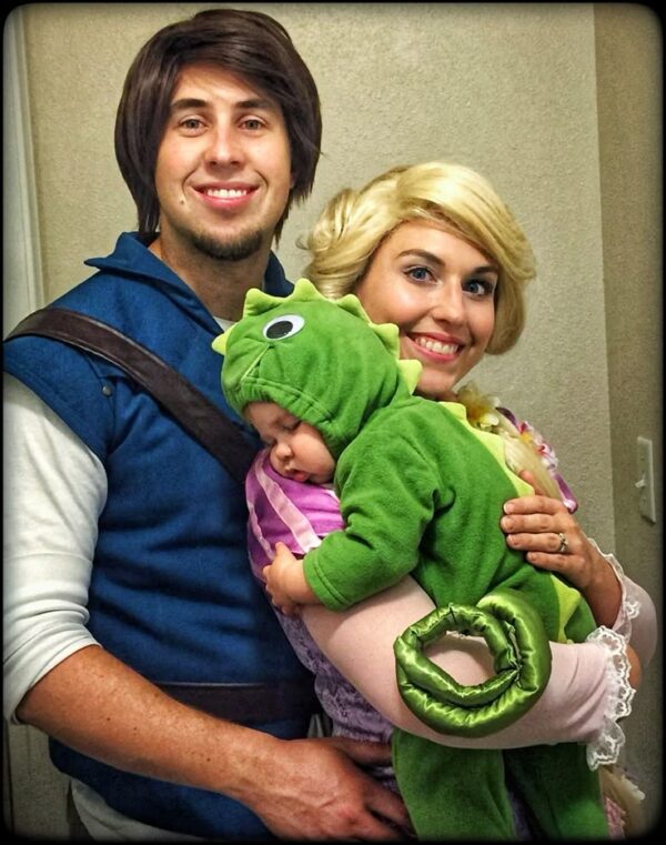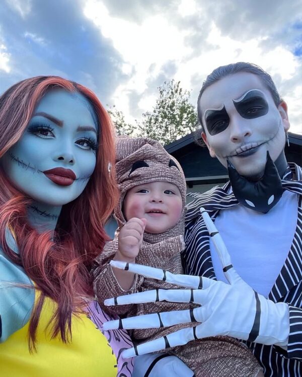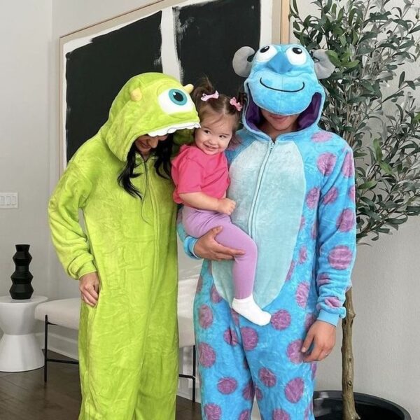 Papás disfrazados de Mike y Sully, con la bebé de Boo. PUNTO. Ya ganaron Halloween.