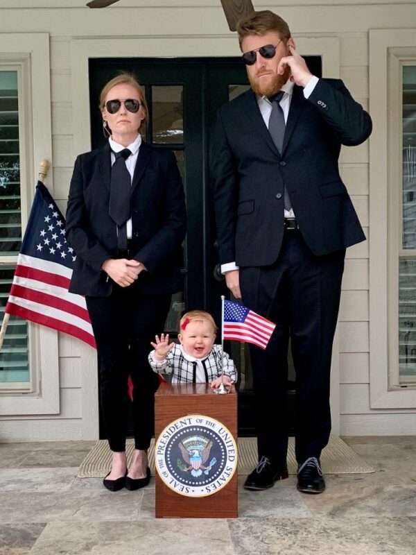 Porque nada grita más “Halloween épico” que tu bebé convertido en presidente y los papás de guardaespaldas