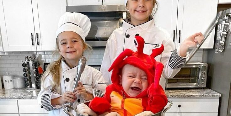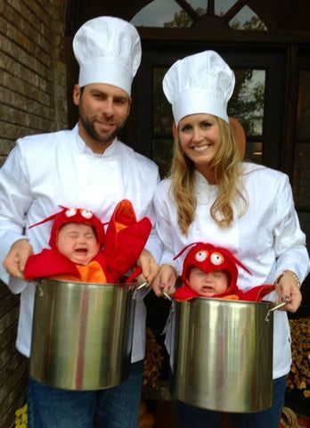 Este es para las familias con humor negro nivel chef. Dos bebés disfrazados de langosta en cazuelas, mientras los papás son cocineros. Cruel, sí. Divertido… también.