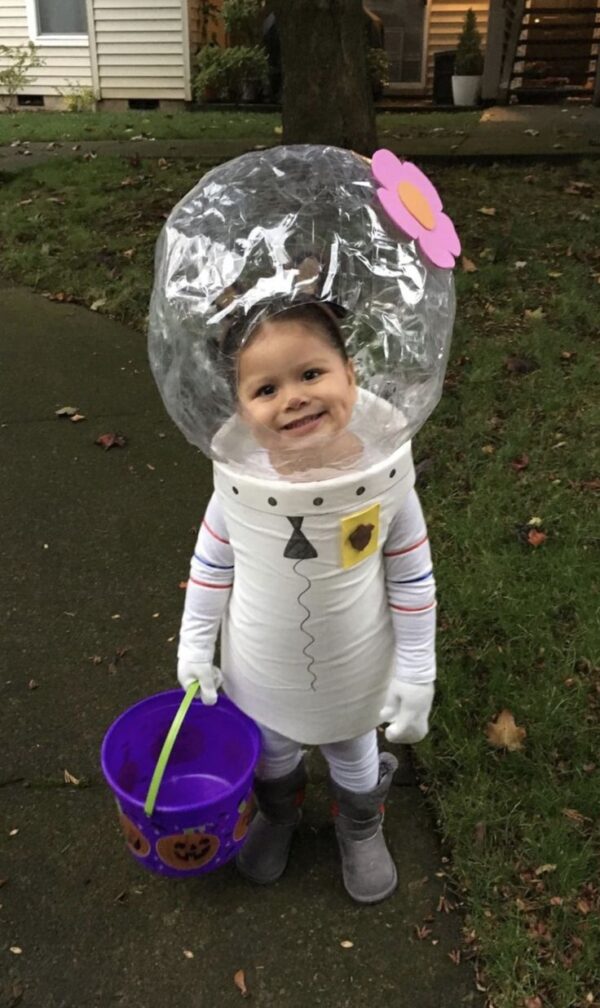 La ardilla de Bob Esponja nunca había sido tan tierna: casco de pecera casero + sonrisa de bebé. Perfecto.