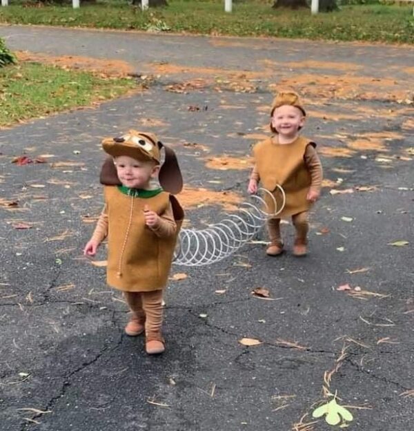 Dos hermanitos disfrazados de la parte delantera y trasera del perro con resortito. 100/10 por creatividad.