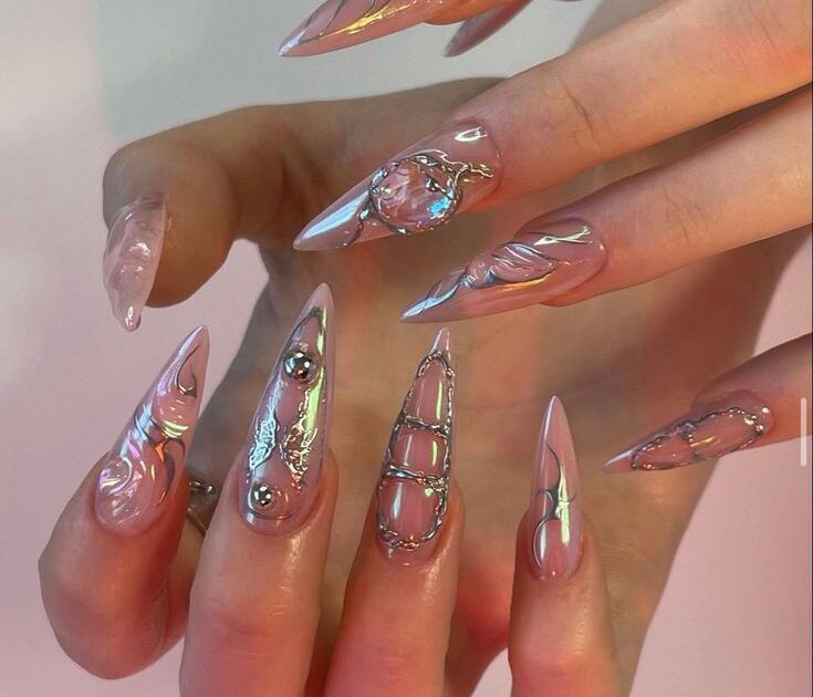 Cromado tipo espejo con una uña en glitch plateado o craquelado.
