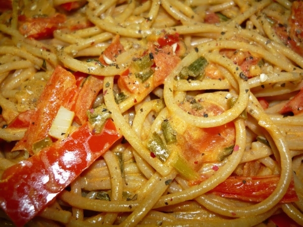 Sofríenos la cebolla, el ajo y el pimiento rojo, todo picado. Agrega las espinacas al sartén, saltéalas 3 minutos y añade sal y pimienta. Vierte la leche evaporada, el caldo de verduras. Añade la pasta previamente cocida, remueve a fuego lento tres minutos, sirve y espolvorea con queso.