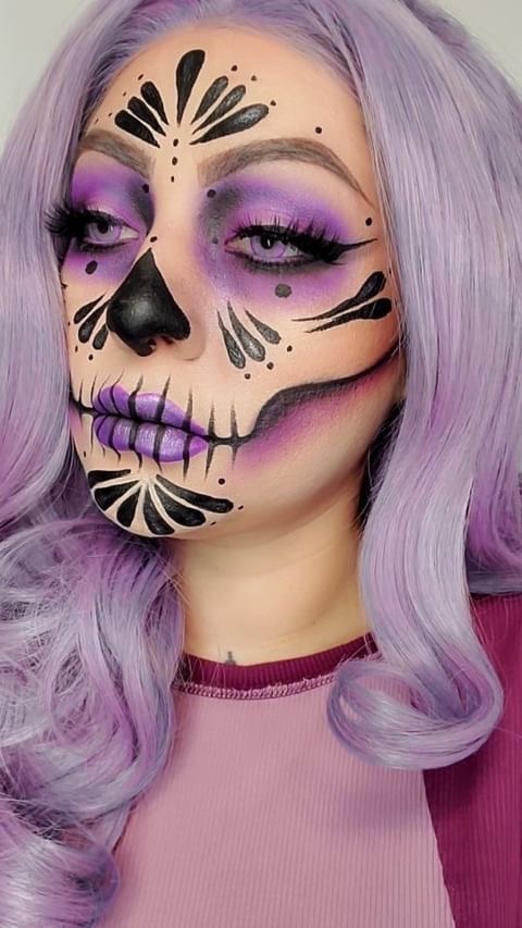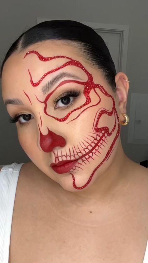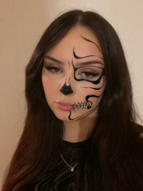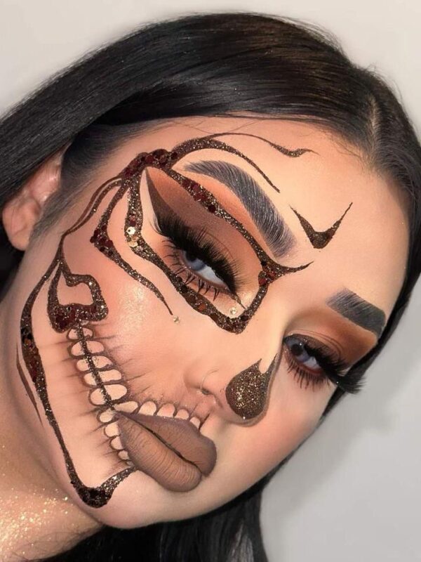 Para las que no quieren complicarse, una versión con solo media cara pintada logra el equilibrio entre elegante y spooky. Perfecto para una fiesta o sesión de fotos.