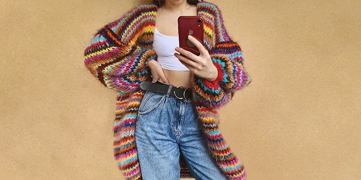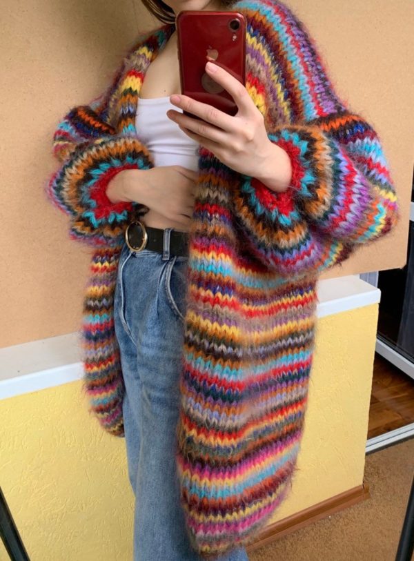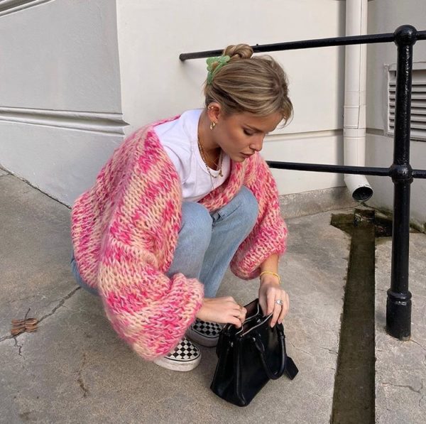 El tie dye no ha muerto, y lo podemos demostrar con cardigans tejidos con hilos multicolor, que crean el efecto perfecto para las VSCO girls.