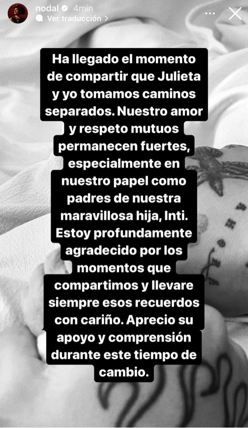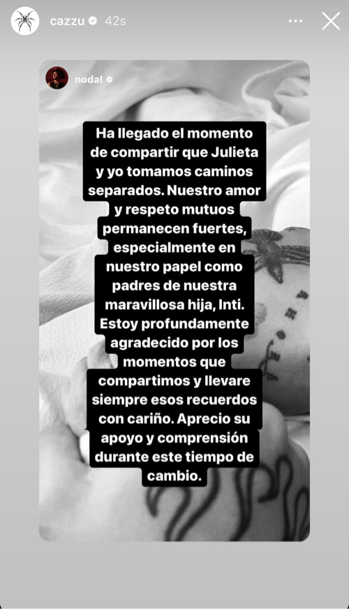 Pues sí, las suposiciones y los rumores sobre que Christian Nodal y Cazzu se estaban separados resultaron ser reales. Lamentablemente ambos han confirmado su separación mediante un comunicado en sus stories de Instagram que dice así: “Ha llegado el momento de compartir que Julieta y yo tomaremos caminos separados. Nuestro amor y respeto mutuos permanecen fuertes, especialmente en nuestro papel como padres de nuestra maravillosa hija Inti. Estoy profundamente agradecido por los momentos que compartimos y llevaré esos recuerdos con cariño. Aprecio su apoyo y comprensión durante este tiempo de cambio”.