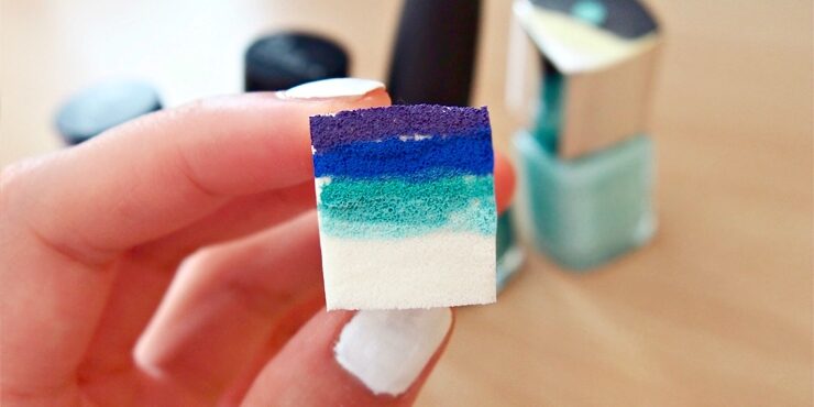 El truco está en revolver en el centro con movimientos circulares ambos colores de esmaltes y luego aplicarlo con una esponja. En caso de querer dar aún más perfección puedes usar una mini brocha para hacer un mejor degradado.
