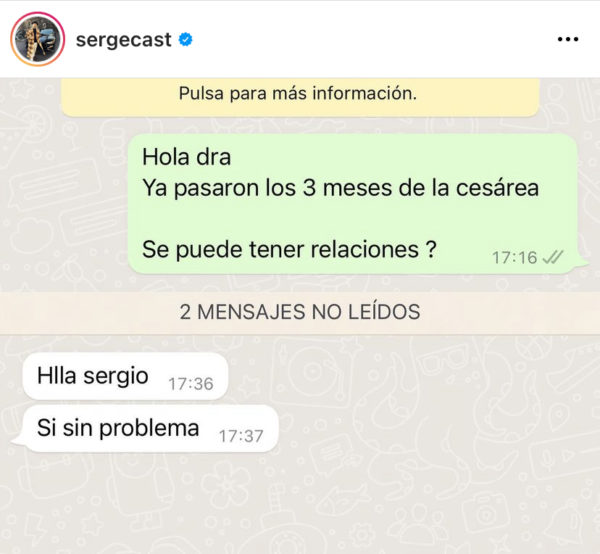 Y esta idea, que no sabemos quién le metió en la cabeza, lo llevó a publicar un mensaje de whatsapp que sostuvo con la ginecóloga de su esposa. Un mensaje que debió haber permanecido en la privacidad, pero él queriendo hacerse el gracioso, lo publicó en Instagram.