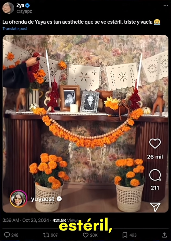 Nuestra querida Yuya no suele meterse en polémicas pero esta vez le tocó ser el centro de las críticas en redes sociales. Y es que ella con su mejor intención y proyectando sus gustos y personalidad, decidió poner una ofrenda y subirnos un video del proceso.