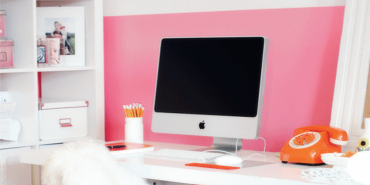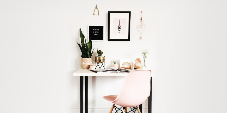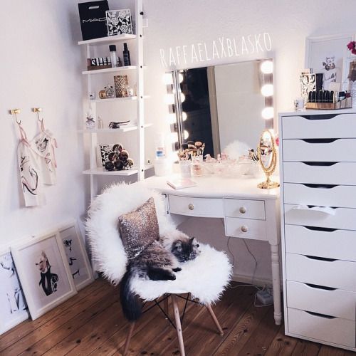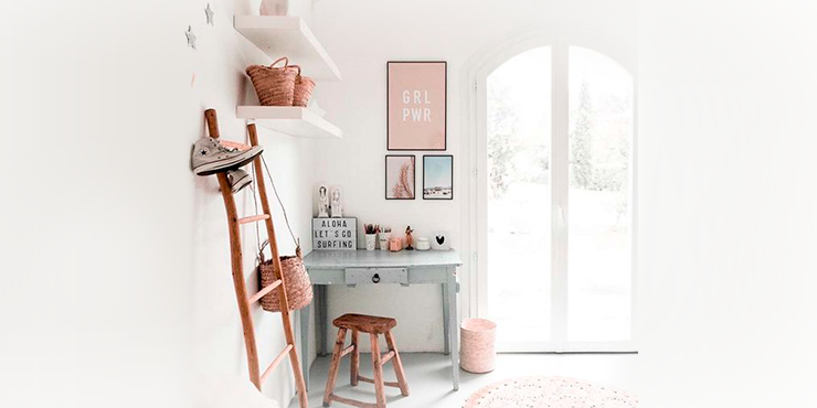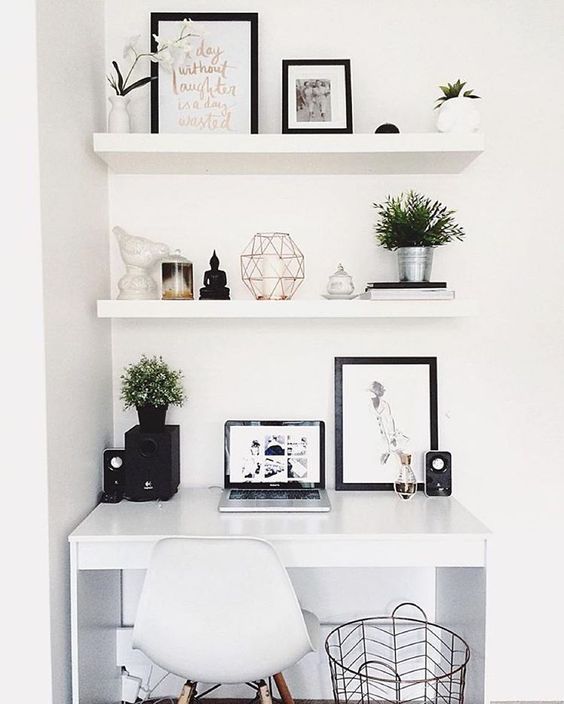 Escritorio pequeño. A veces lo minimalista es la mejor opción para no sentirte saturada en tu propio espacio. Un escritorio de este estilo y de un solo color puede ser lo que le hace falta a tu habitación. Mira lo lindo que contrasta con las decoraciones negras.