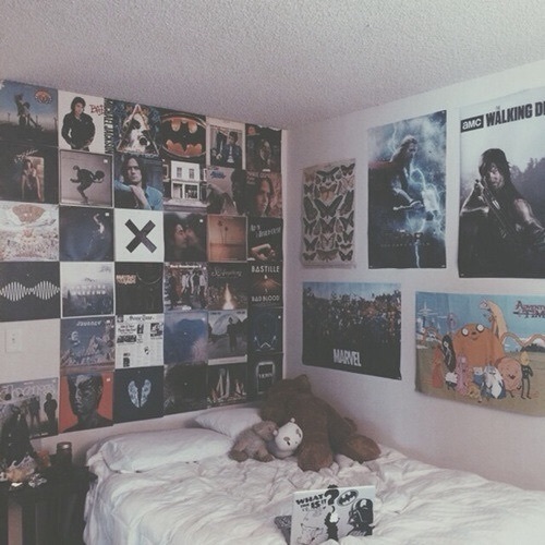 Pared decorada con portadas de vinilos. ¿Acaso hay algo más noventero que esto? Si te gusta todo lo retro, esto es para ti.