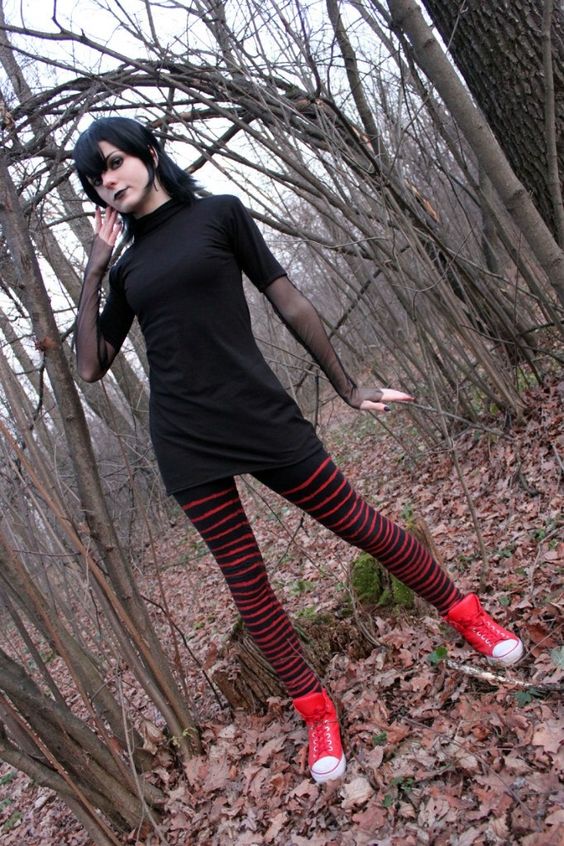 Mavis, es excelente disfraz. Sólo maquíllate con sombras y labial negro. Ponle un poco de gel a tu cabello y consigue unas medias a rayas rojas.