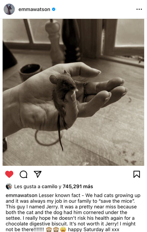 Resulta que Emma salvó a un pequeño ratón de las fauces de sus mascotas, y el ratoncito se sintió tan en paz con Emma que nos hizo creer por un segundo que en lugar de personificar a ‘Bella’, Emma tuvo que haber sido La Cenicienta.