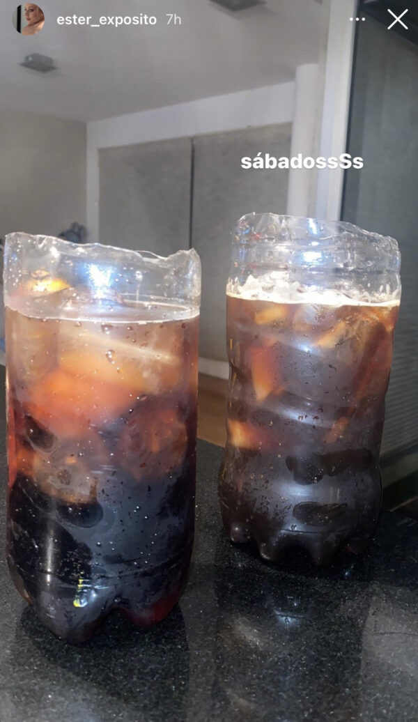 Ester publicó una foto casual de sabadito en sus stories de Instagram, en la que aparecían dos vasos llenos de refresco y hielos. Y ahí la cosa iba bien, pero si miras con más atención, te darás cuenta que no son vasos sino botellas de refresco de plástico, partidas por la mitad.