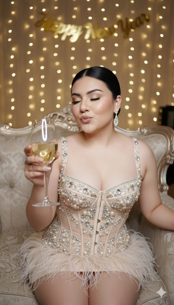 Usa los rasgos faciales de la foto adjunta sin modificar el rostro. Crea una fotografía fotorrealista de lujo, estilo editorial, de una mujer joven con cabello negro natural recogido en un peinado elegante y pulido, con raya al centro o ligeramente de lado, brillo realista y algunos baby hairs sutiles. Está sentada con actitud segura en una silla lounge ornamental, ligeramente recostada hacia atrás, transmitiendo glamour relajado. Su expresión es alegre y juguetona, labios levemente fruncidos como en pleno brindis, ojos suavemente cerrados o entreabiertos. Sostiene una copa grande de vino blanco hacia la cámara, creando un primer plano fuerte con reflejos reales en el vidrio y refracción natural del líquido. Viste un mini vestido tipo corsé de alta moda, estructurado y con varillas visibles, adornado con perlas, cristales y pedrería fina en tonos champán, marfil y plata. La falda tiene un acabado con plumas suaves y realistas, con textura natural y ligero movimiento. Lleva solo aretes de cristal refinados, joyería mínima para mantener elegancia.