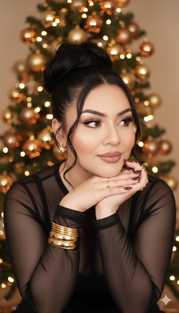 Crea una imagen realista respetando completamente los rasgos faciales sin modificar el rostro, usando la foto adjunta como referencia facial. Retrato festivo de una mujer joven en un ambiente interior elegante. Tiene el cabello oscuro recogido en un moño alto con volumen estilo messy bun, con mechones ondulados enmarcando el rostro. Lleva maquillaje glamuroso: ojos intensamente maquillados con pestañas postizas largas, delineador definido y sombras en tonos café oscuro; cejas oscuras y bien estructuradas; labios nude rosado con delineado marrón y brillo. Está sonriendo suavemente, mirando hacia la derecha fuera de cámara, con una expresión alegre y pensativa. Sus manos están cruzadas debajo de la barbilla en una pose delicada y estética. Viste una prenda negra de manga larga en malla o tul transparente, ajustada al cuerpo. Usa múltiples brazaletes dorados anchos y gruesos apilados en la muñeca derecha, varios anillos pequeños en los dedos y pendientes pequeños tipo aro. Uñas largas, forma almendrada, en tono oscuro (marrón o burdeos). Al fondo, ligeramente desenfocado con efecto bokeh, se aprecia un árbol de Navidad grande y ricamente decorado con esferas doradas y bronce, y luces cálidas que generan un resplandor festivo. La iluminación es suave y cálida, resaltando los reflejos dorados de las joyas y la decoración. Estética sofisticada, glamurosa y navideña. Fotografía estilo editorial, alta calidad, realista, HD.