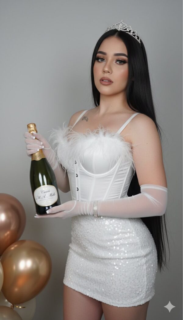 Usa la foto adjunta como referencia facial y crea una fotografía de una mujer joven y glamurosa, con cabello negro lacio largo hasta la cintura, posando mientras sostiene una botella de champán etiquetada como “Cuvée de M. A. Melle”. Ella mantiene una mirada directa a la cámara, segura y elegante. Estilo y vestuario Tema: Glamour de fiesta, Nochevieja, celebración. Ropa: Top blanco tipo corsé o bustier, adornado con plumas blancas en la parte superior, combinado con falda blanca de lentejuelas. Accesorios: Guantes blancos largos y transparentes (sheer), tiara o diadema blanca, y pulsera de diamantes o cristales en la muñeca derecha. Maquillaje: Piel impecable, smoky eyes, delineado gatito, pestañas grandes, cejas definidas y labios nude/rosados. Uñas: Manicure francés. Composición y contexto Pose: Cuerpo ligeramente inclinado en ángulo diagonal, sosteniendo la botella. Fondo: Neutro (gris o blanco muy claro), desenfocado para resaltar al sujeto. Detalle extra: Globos de fiesta en tonos dorados, beige y bronce, visibles de forma sutil en la esquina inferior izquierda. Iluminación y calidad Iluminación de estudio (softbox), fuerte y uniforme, con brillo en el cabello, lentejuelas y vidrio. Sombras suaves. Alta resolución, nítida, calidad profesional. No cambiar el rostro.