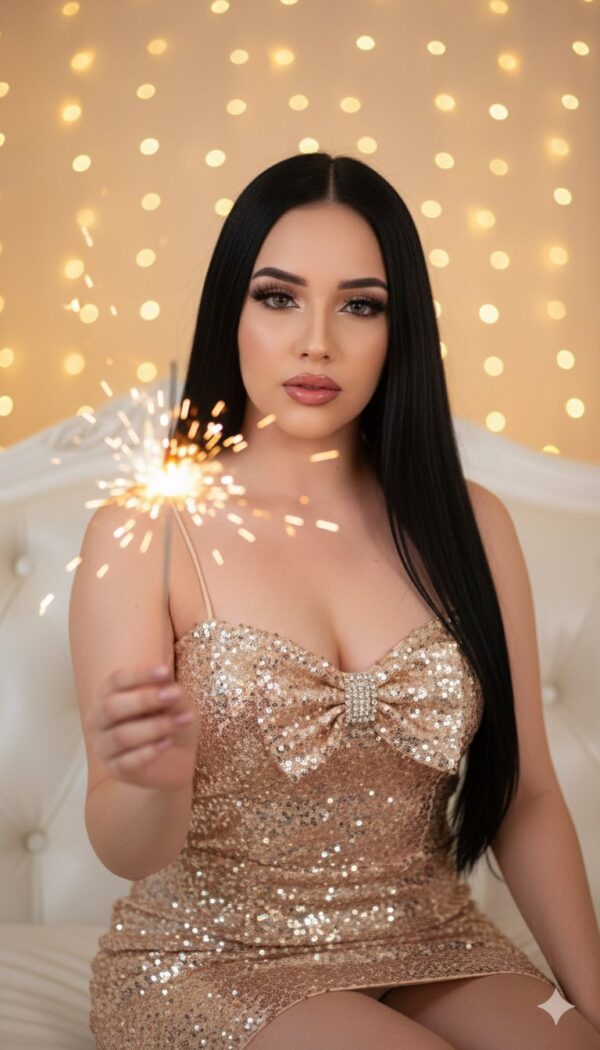 Usa la foto adjunta como referencia facial y crea una fotografía de una mujer joven, elegante y glamorosa, con cabello negro, lacio y largo hasta la cintura, mirando directamente a la cámara. Maquillaje glamoroso con piel impecable e iluminada, delineado de ojos tipo gato, pestañas grandes y voluminosas, sombras oscuras bien difuminadas y labios rosados brillantes. Lleva un vestido de fiesta de lentejuelas color champán o plateado, ajustado al cuerpo, con tirantes finos y un detalle de lazo en el busto adornado con un broche plateado. La mujer está sentada en un sofá blanco y sostiene en la mano derecha una vela de chispa (sparkler) encendida, creando destellos de luz cálida y un efecto estrellado en primer plano. El fondo es interior, acogedor y festivo, cubierto por luces de hadas que generan un efecto bokeh suave y brillante, evocando una celebración de Año Nuevo. Iluminación cálida y suave tipo estudio, bien balanceada, resaltando el brillo del vestido, la piel y la chispa. Estilo fotografía de estudio, glamour festivo, retrato editorial, alta calidad, ultra detallada, realista, resolución 4K. No cambiar el rostro. Mantener rasgos faciales fieles a la imagen de referencia.