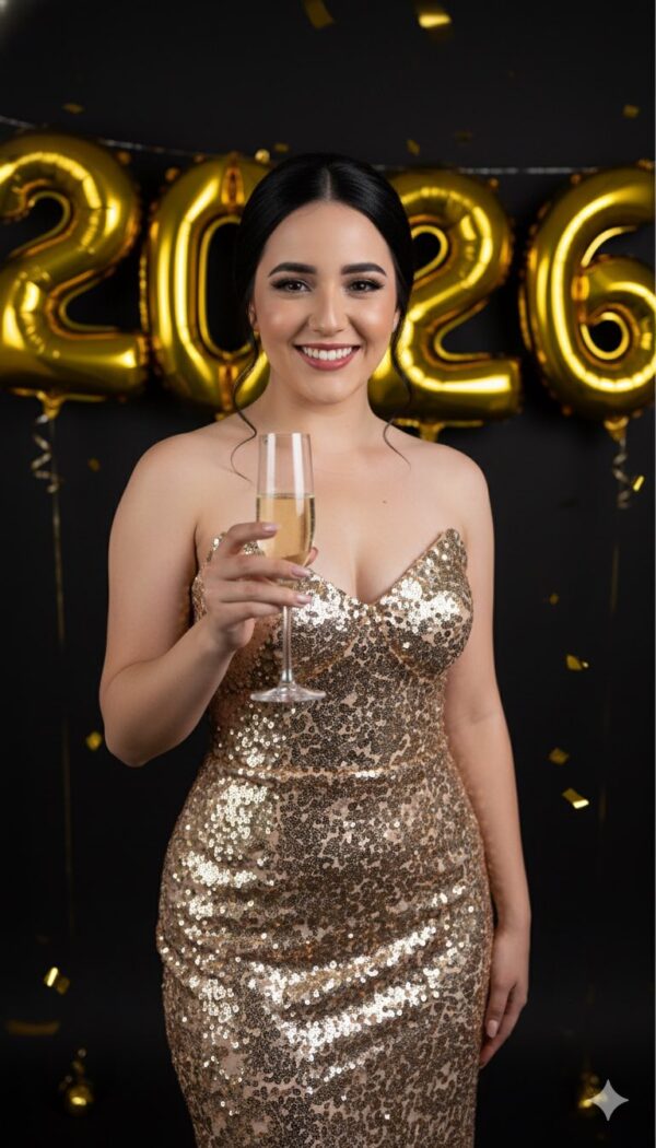 Usa la foto adjunta como referencia facial y crea una fotografía de una mujer elegante, joven y atractiva, en un ambiente de fiesta nocturna y sofisticado. Ella lleva un deslumbrante vestido de fiesta tipo tomara que caia y ajustado, con lentejuelas en color dorado metálico/champán. Su cabello negro está recogido en un moño o peinado elegante. Está sonriendo de forma espontánea, mirando directamente a la cámara. En su mano derecha sostiene una copa de champán flute con líquido espumoso. Pose de celebración o brindis. Maquillaje natural y elegante: piel impecable e iluminada, delineado tipo gato, pestañas grandes, labios rosados. Fondo completamente negro mate, alto contraste, globos dorados con los números 2026. Confeti dorado flotando o cayendo alrededor. Estilo e iluminación: Fotografía de estudio, moda, editorial de revista. Iluminación dramática tipo chiaroscuro: luz fuerte principal que resalta el brillo del vestido, fondo oscuro. Ultra-detallada, fotorrealista, 8K, bokeh suave. No cambies mi rostro.