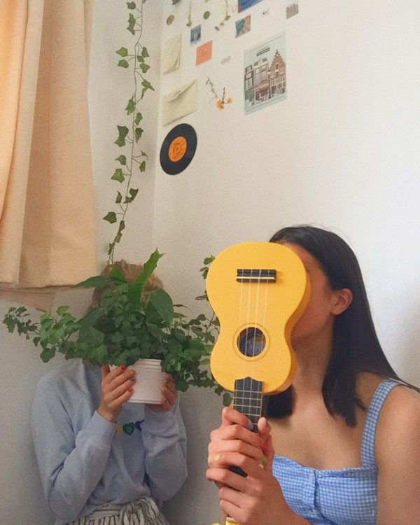 Tomen cosas cool de tu cuarto, un ukelele, maceta, disco de acetato, libro ¡lo que sea! Y colóquenlo en sus rostros.