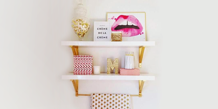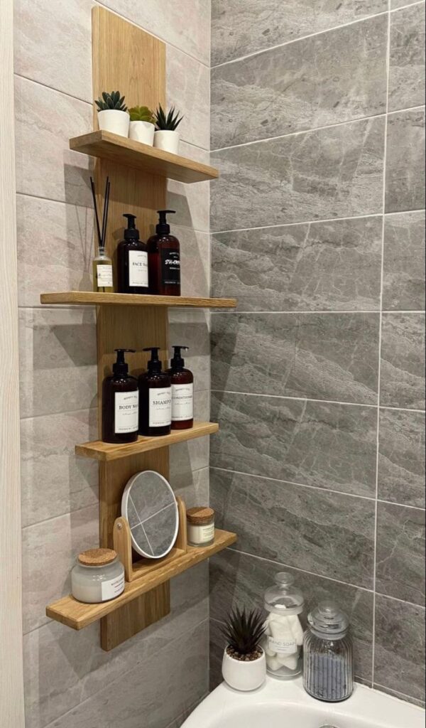 Toallas, frascos, velitas, cremita, decoración y tu shampoo con empaque bonito. Esta repisa es básicamente el “clean girl aesthetic” en versión mueble.