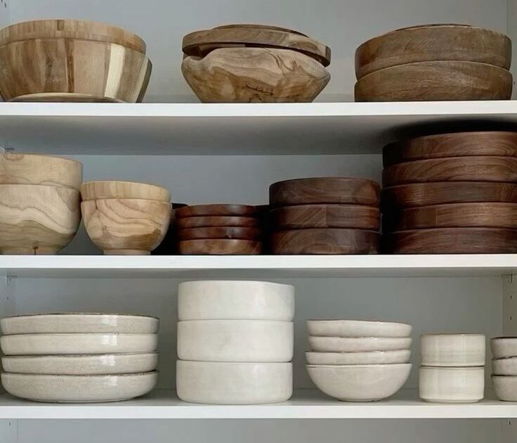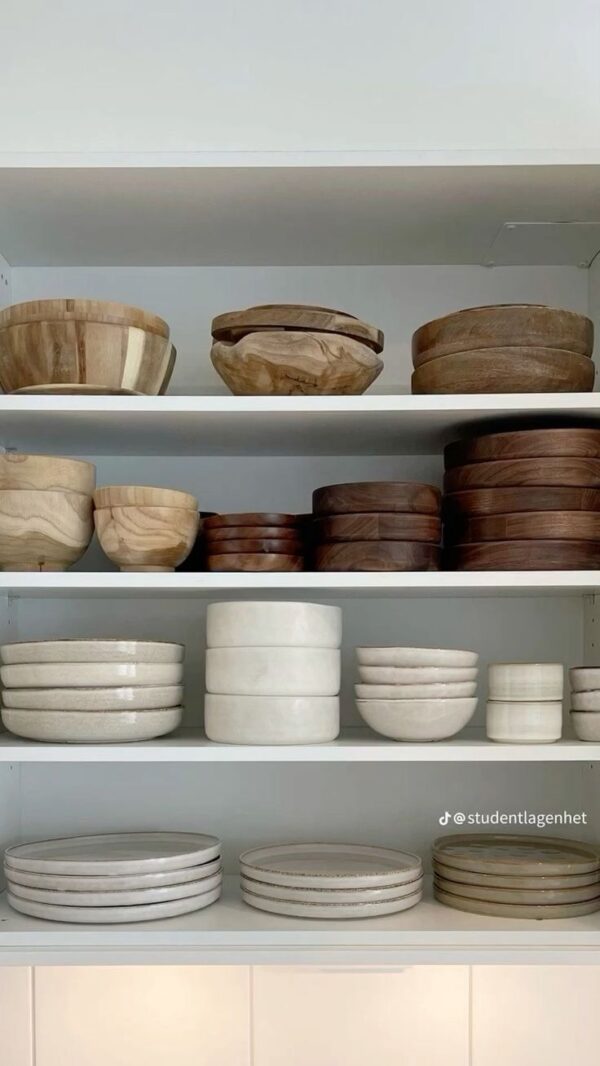 Platos y bowls bien organizados + cerámica neutra = cocina que parece showroom nórdico. Nadie necesita saber que vives a base de cereal.