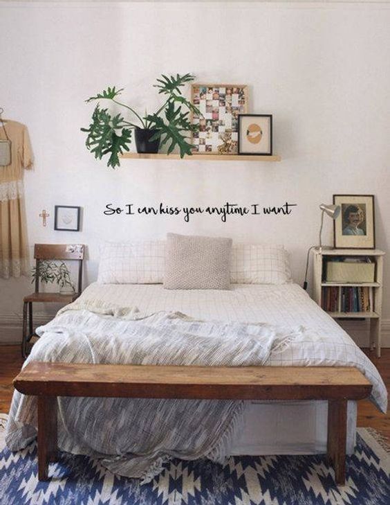 Si no tienes una cabecera, coloca una frase para darle un toque muy original a ese espacio de la pared. Si arriba de ella pones una repisa, se verá aún más chic, pues ayudará a cuadrar todo.