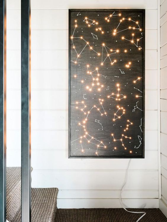 Es más fácil de lo que crees. Puedes colocar tela o papel en un marco y simplemente hacerle hoyitos creando al forma que desees. Al final pegas la serie navideña detrás y listo.