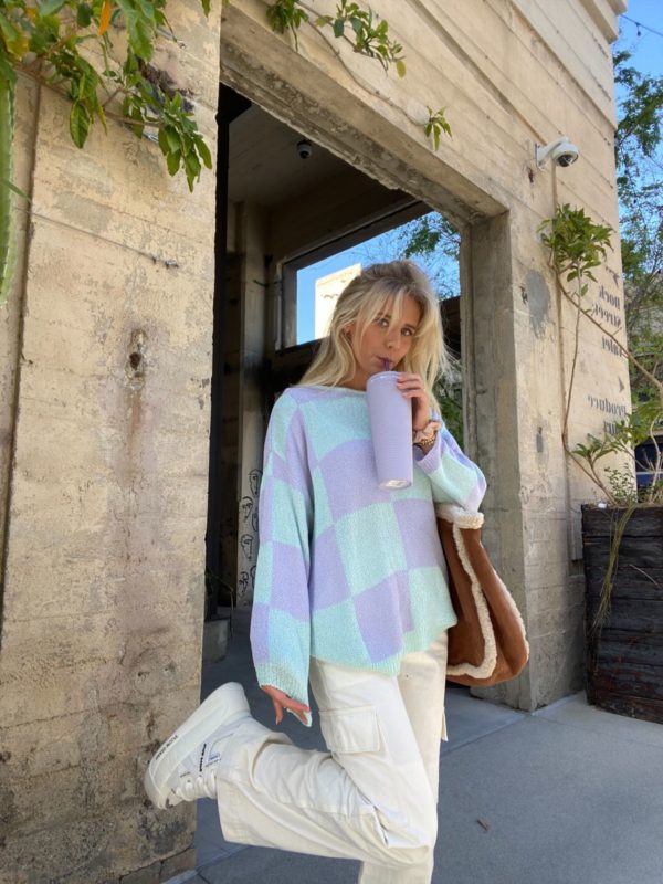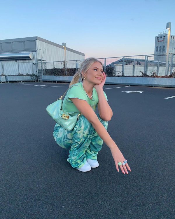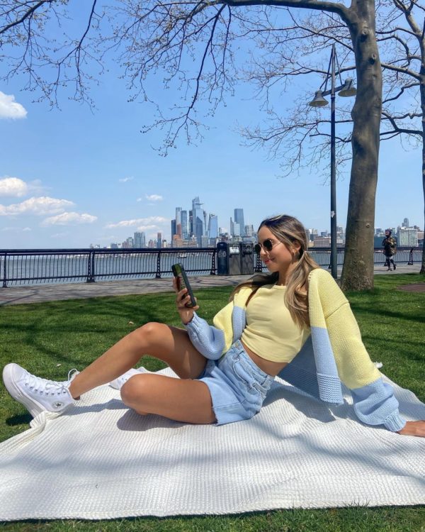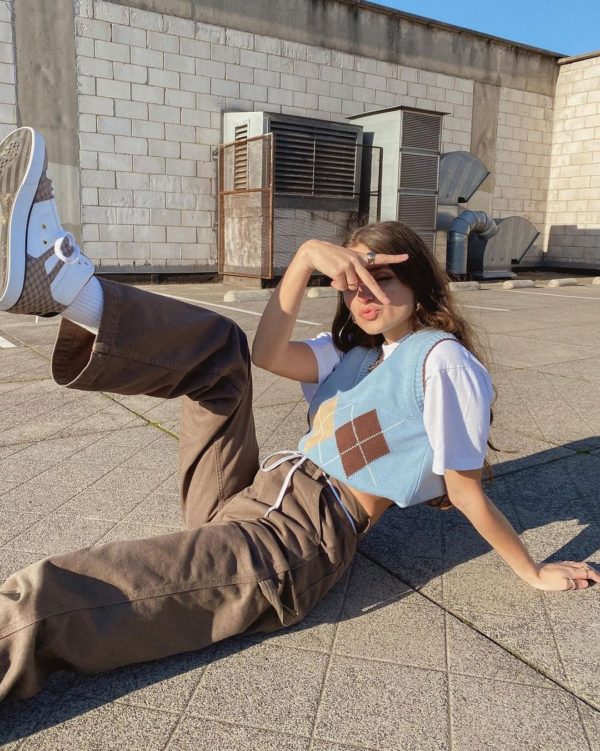 En cuclillas, ideal para que salga tu outfit completo, cara y accesorios juntos.
