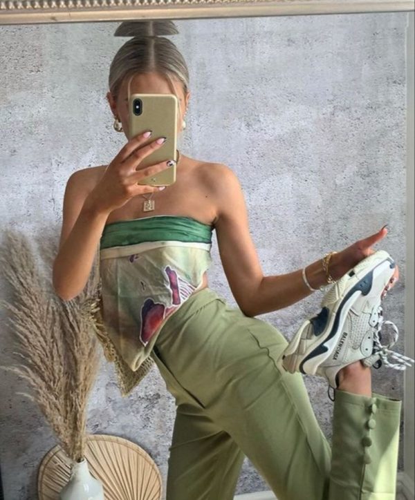 Mirror selfie con pie elevado sólo o sujetarlo con ayuda de tu mano, esta pose sirve para estirar y aplanar tu vientre.