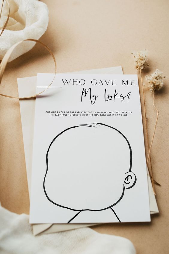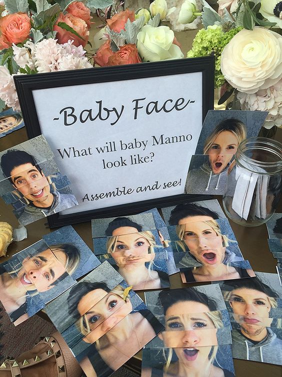 Coloca muchas fotos tuyas y de tu pareja (con diferentes caras, ropa y peinados? cortadas en horizontal. Para que tus invitadas armen la posible cara del bebé. El resultado será muy divertido.