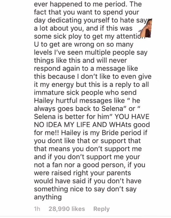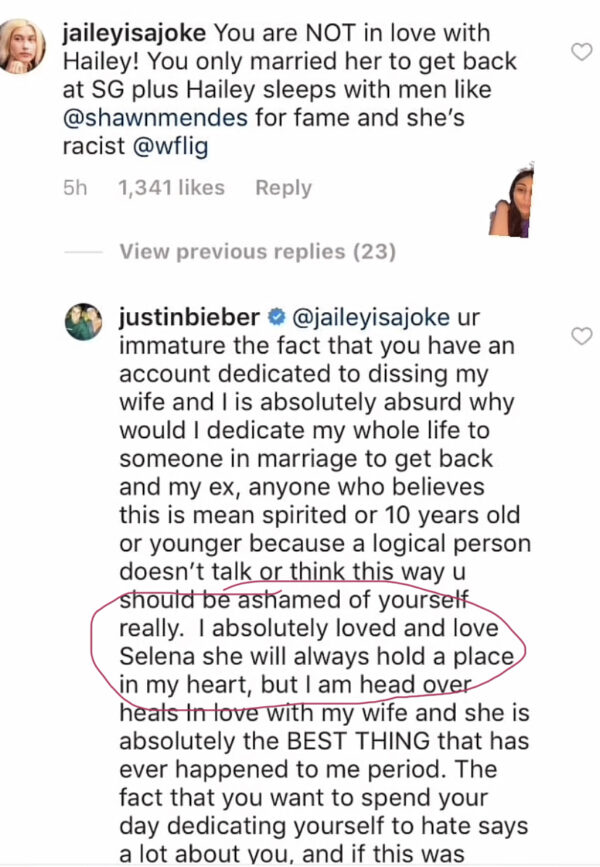 Y fue justo a una de estas fans y en uno de estos comentarios en donde Justin descargó todo lo que siente respecto a este escándalo y sin que lo viéramos venir escribió: `Amé y amo a Selena, ella siempre tendrá un lugar especial en mi corazón, pero estoy enamorado de mi esposa’.