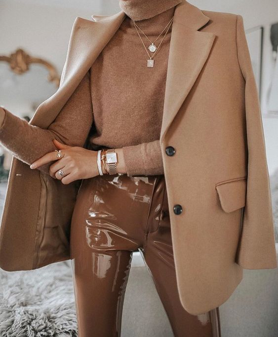 Investiga su chocolate favorito, si es acaramelado, busca unos pantalones de vinil color caqui, agrega un suéter y abrigo claro.
