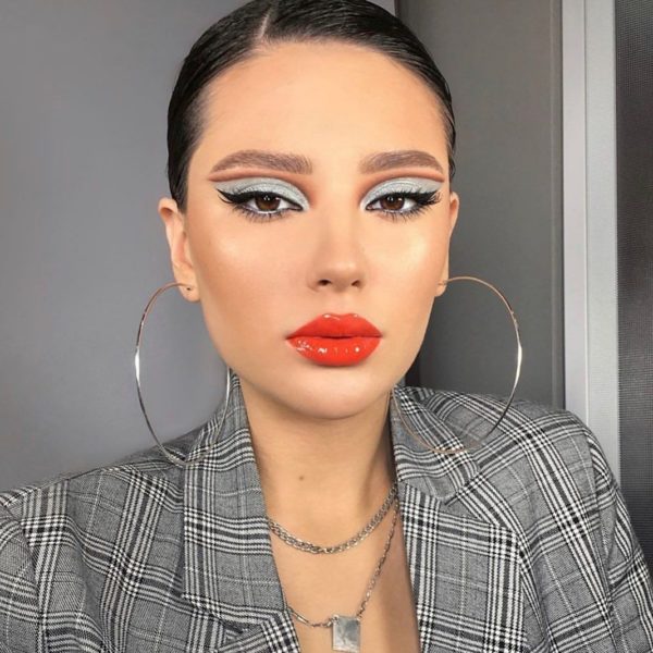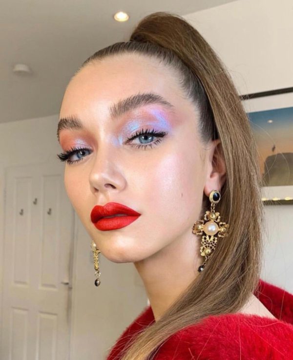 Sombra tornasolada clara con labios rojos intensos. Siguiendo la regla de contraste, si llevas unos labios intensos prueba con una sombra clara pero trendy.