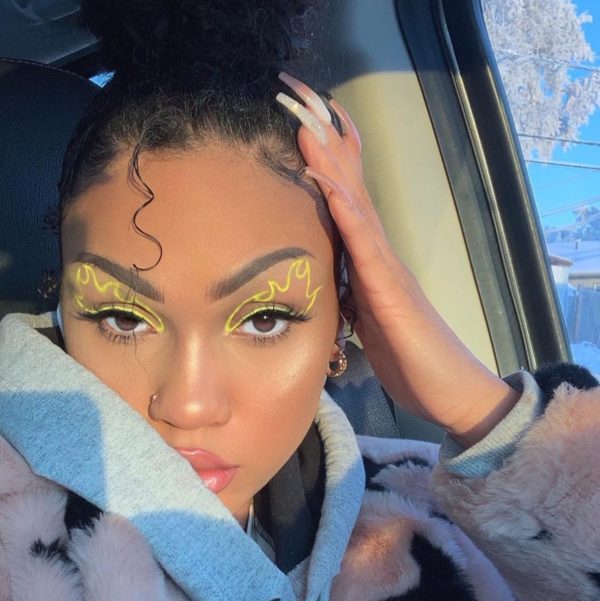 Si no tienes delineadores de color, usa tus sombras. Recorta flamas en un papelito, pégalo debajo de la ceja, maquilla normal y al despegarla ya tendrás la forma de las llamas.