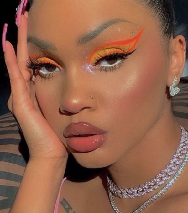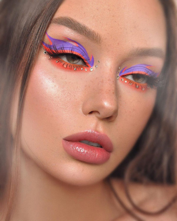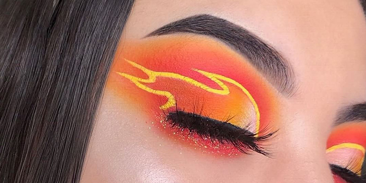 Haz un graphic eyeliner más abstracto, con delineado flotante color naranja y rellena con sombra amarilla, como si se tratara de una llamarada.
